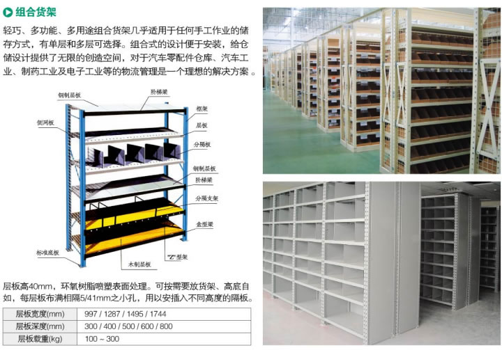 輕型貨架結(jié)構(gòu)1、貨架立柱:由等邊角鋼雙邊沖孔制成,孔距離以50mm距離沿直線排列,立柱孔用來掛接層板之用;2、貨架鋼層板:采有冷軋鋼板按所需尺寸四邊折彎成型。3、立柱與鋼層板通過速扣卡銷和三角型固定片連接與固定組成的貨架。4、貨架各部件加工好成型之后全部經(jīng)打磨 > 酸洗磷化 > 全自動粉末靜電噴涂 > 烘干等工藝處理后組裝成品。生產(chǎn)出的貨架成品表面光潔、美觀;層板可上下任意調(diào)節(jié),拆裝方便。